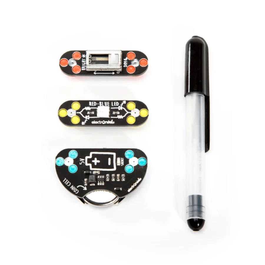The Circuit Scribe Mini Kit is an accessible introduction to electronics featuring a compact version of our conductive ink pen. This affordable mini circuit module kit guides you along exploration of basic circuit concepts by drawing conductive doodles & creating paper-based switches with a mini ink pen.